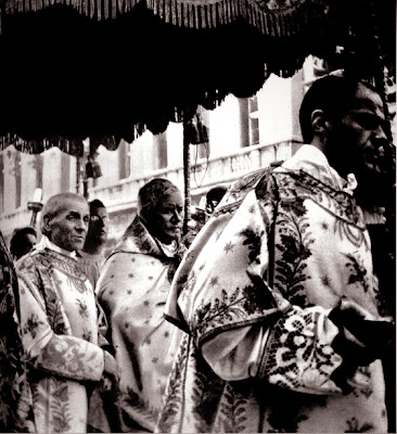 | A procession of the Blessed Sacrament. Pope Pius is seen here bearing the monstrance. |